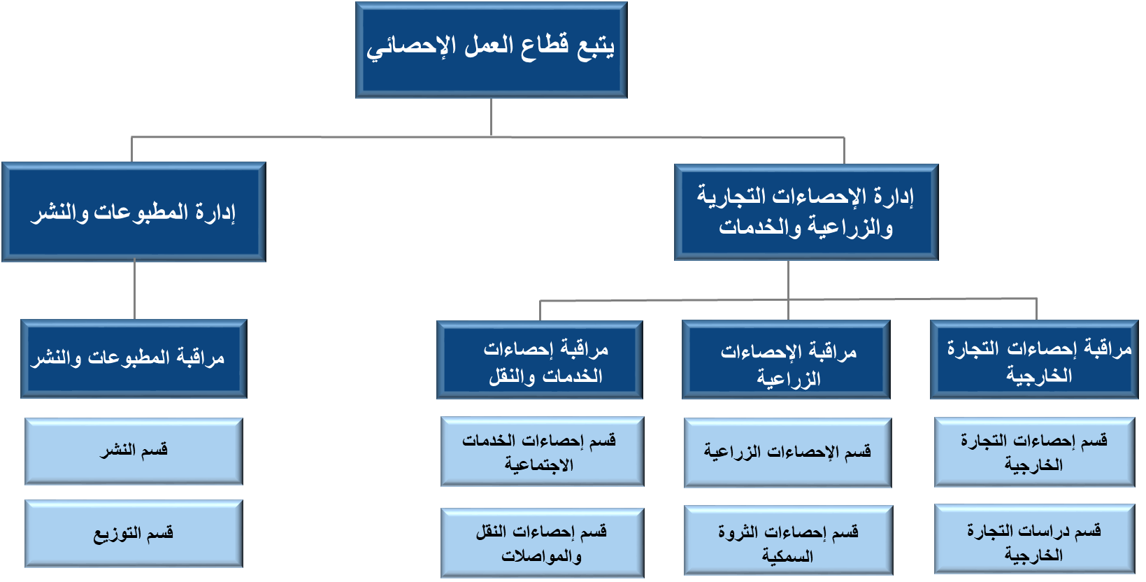 د- الإشــراف عـلى أعـمــال الإحصاءات التي تـقـوم بهـا الأقسـام المخـتصـة بـذلـك في كافـة الوزارات والإدارات والمؤسـسات والشركــات التي تـسـاهـم الحكومة فـيها ، والتـنسـيق بين أعمالــها الإحصائية ، وتقــوم كل وزارة أو هيـئة أو مؤسـسة حكومية بإنشاء قسم للإحصاء.